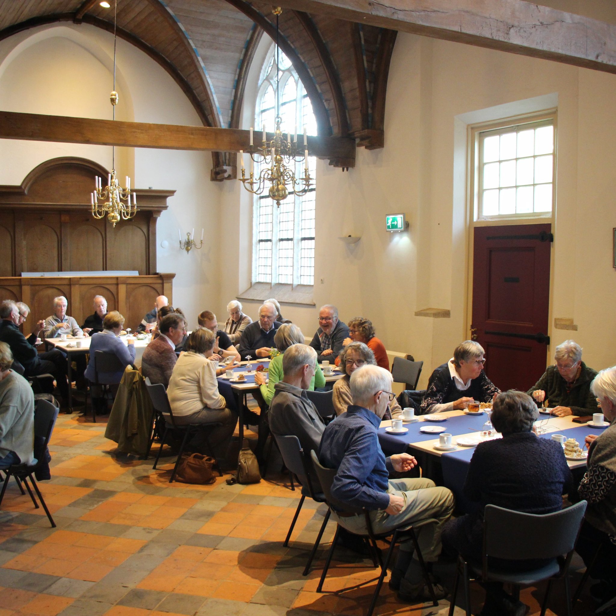 De dag was georganiseerd door de beheercommissie van de Sint-Joriskerk. Voorzitter Harm en commissielid George verwelkomden iedereen hartelijk met koffie en gebak in de Gerfkamer. Daar ontstonden al snel levendige gesprekken.